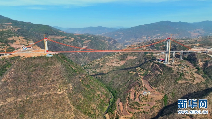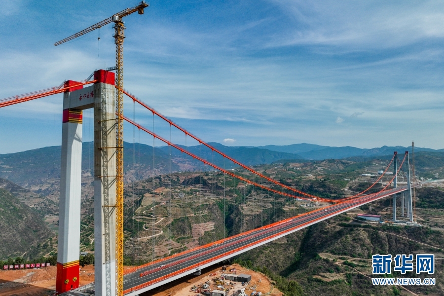 Yongren Bridge is located in the mountainous area at the junction of Yongren County and Dayao County in Chuxiong Yi Autonomous Prefecture in Yunnan Province. Crossing the river canyon, Yongren Bridge has a total length of 1668 meters, which is a double-tower single-span steel box stiffened beam suspension bridge. The height of the Yongren side’s main tower is 192.7 meters, while that of the Dayao side’s main tower is 107.7 meters, with the bridge deck as high as 350 meters from the bottom of the river canyon. The bridge is the largest highway suspension bridge under construction in Chuxiong and the third largest in Yunnan. At present, the construction of the Yongran Bridge is entering its final stage.