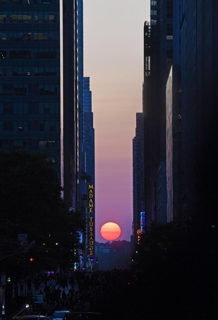 This photo taken on May 30, 2023 shows the Manhattanhenge in Manhattan of New York, the United States. (Xinhua/Li Rui)