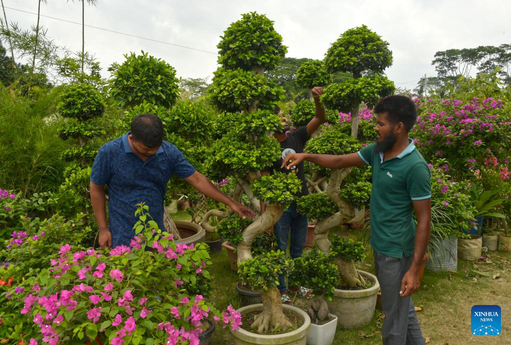 Gardeners nurture Chinese topiary plants during a tree fair in Dhaka, Bangladesh, June 13, 2023. A month-long tree fair, entitled "National Tree Fair", kicked off here on June 5 in Dhaka. (Xinhua)