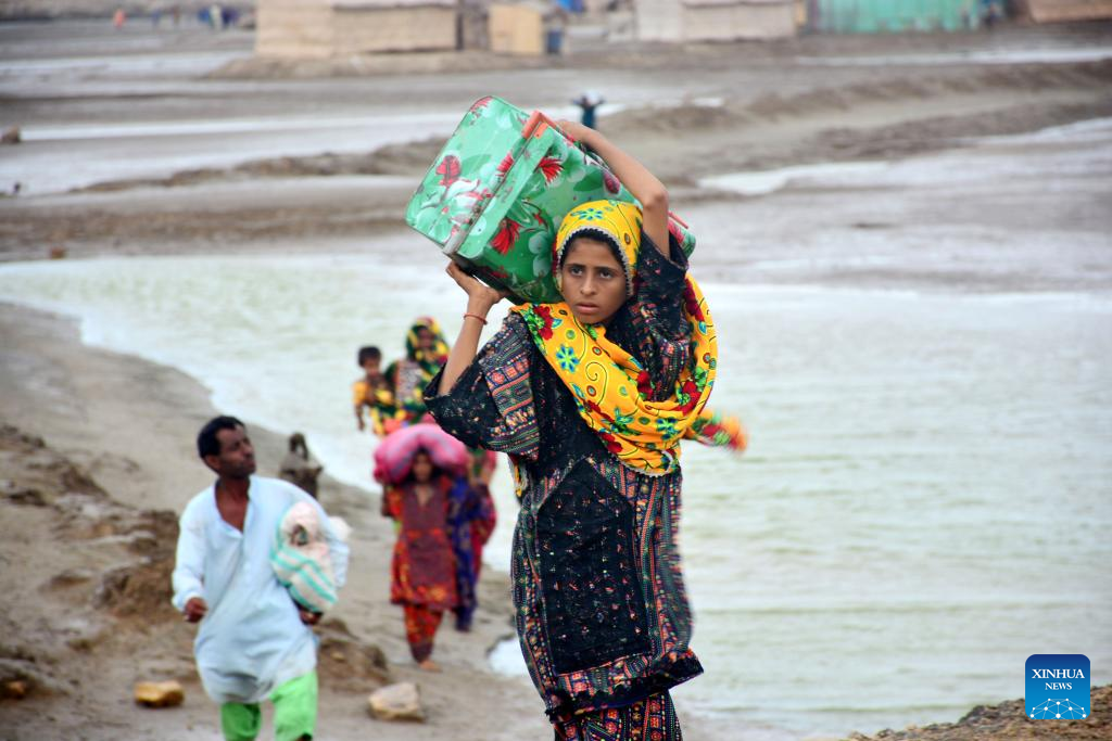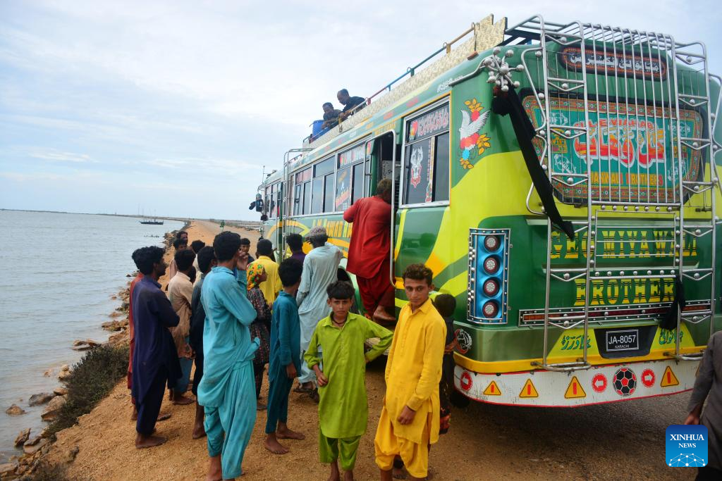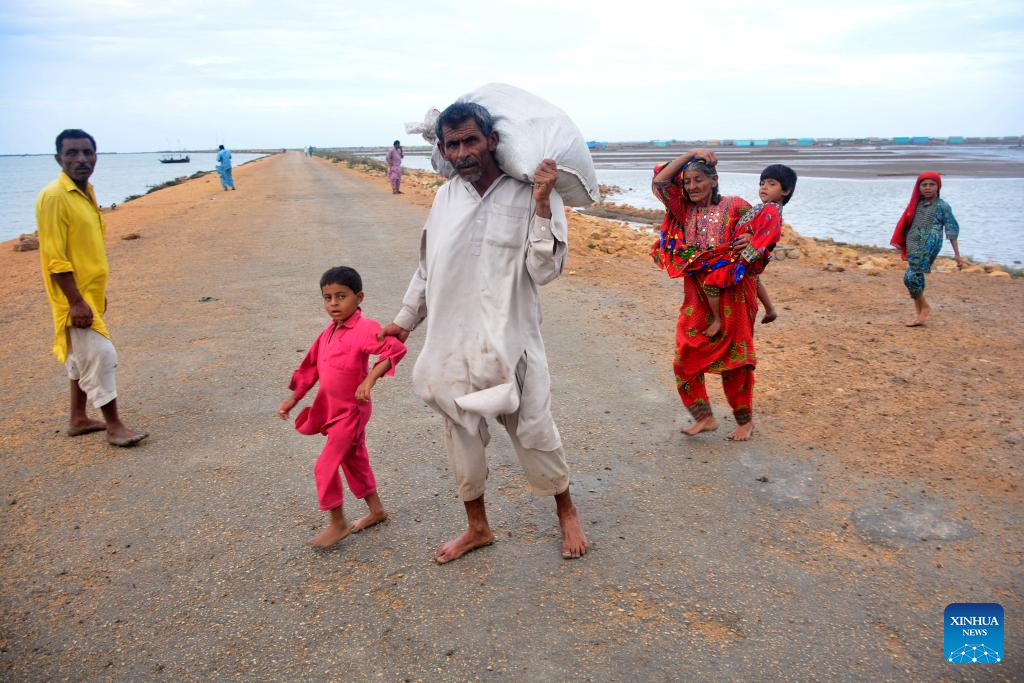 People are pictured as they evacuate from Thatta district of southern Pakistan's Sindh province on June 13, 2023. Pakistan will evacuate around 100,000 people as part of its efforts to ensure the safety of those living in the country's coastal area ahead of Cyclone Biparjoy, according to National Disaster Management Authority (NDMA) chairman Inam Haider Malik. (Str/Xinhua)