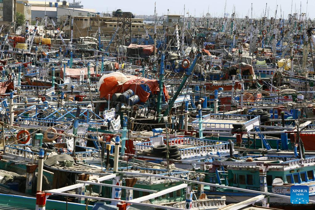 Fishing boats are seen berthing in Thatta district of southern Pakistan's Sindh province on June 13, 2023. Pakistan will evacuate around 100,000 people as part of its efforts to ensure the safety of those living in the country's coastal area ahead of Cyclone Biparjoy, according to National Disaster Management Authority (NDMA) chairman Inam Haider Malik. (Str/Xinhua)