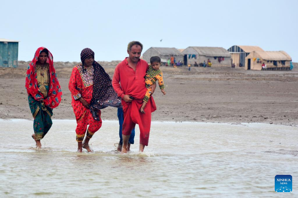 People wade through water as they evacuate from Thatta district of southern Pakistan's Sindh province on June 13, 2023. Pakistan will evacuate around 100,000 people as part of its efforts to ensure the safety of those living in the country's coastal area ahead of Cyclone Biparjoy, according to National Disaster Management Authority (NDMA) chairman Inam Haider Malik. (Str/Xinhua)