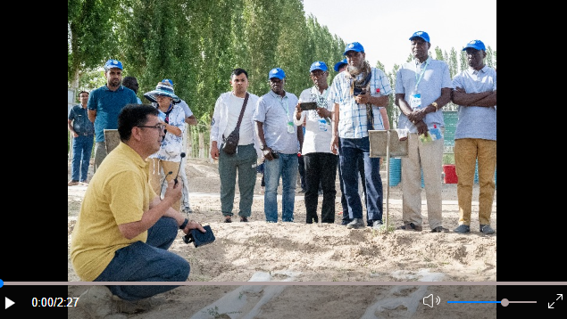 A Chinese expert introduces desert plants to people from central Asian countries at a desert research station in northwest China's Xinjiang Uygur Autonomous Region, June 13, 2023. (Xinhua/Zhou Shengbin)