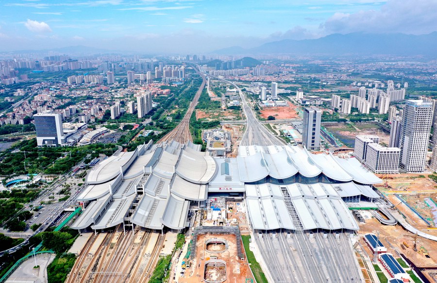 This aerial photo taken on June 19, 2023 shows the newly built part of Xiamen North Railway Station on the Fuzhou-Xiamen high-speed railway in Xiamen, Fujian Province.(Xinhua/Wei Peiquan)