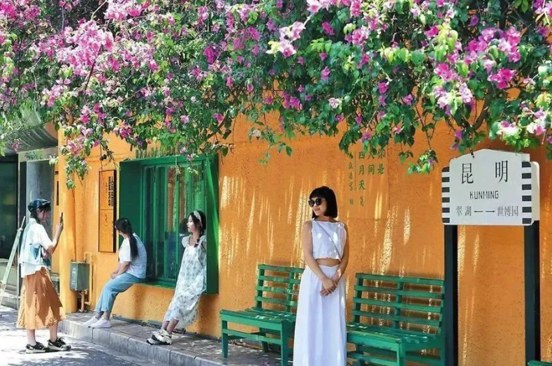 During the summer, you can find artistic cafes along the street, surrounded by blooming bougainvillea trees and bright "Kunming Yellow" walls. You can also see the "Cuihu Park-Kunming World Horticultural Expo Garden" railway station sign and the ancient memorial archway of Zhaogong Temple. Many tourists and locals can be seen here. Huanggong East Street, located in the east section of Cuihu South Road, Kunming, has recently become a popular place, attracting many citizens and tourists to take pictures.
