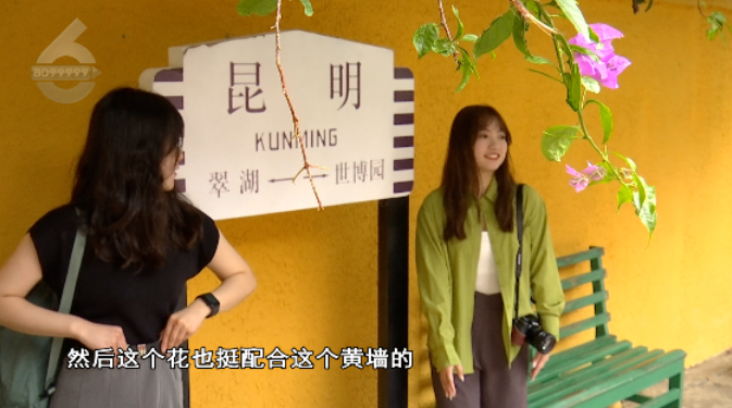 Strolling on the street, a beautiful yellow wall comes into view. The bougainvilleas hang on the green bench, and the sunlight shines through the leaves, reflecting on the yellow wall. When leaning on the wall, it feels like returning to the old Kunming full of memories.