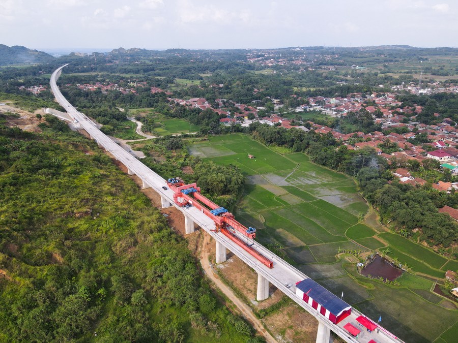 This aerial photo taken on Oct. 16, 2022 shows the construction site of the erection of the last box girder along the Jakarta-Bandung High-Speed Railway in Purwakarta, Indonesia. (Xinhua/Xu Qin)