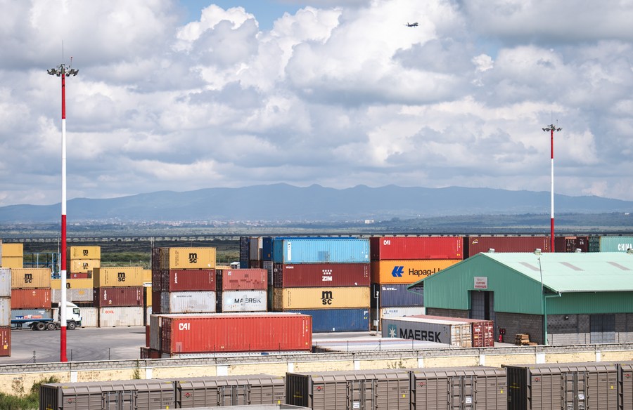 This photo taken on May 23, 2023 shows containers to be transported near the Nairobi Station of the Mombasa-Nairobi Railway in Nairobi, Kenya.(Xinhua/Wang Guansen)