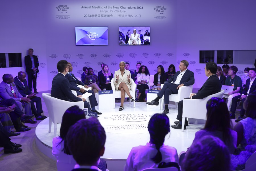 A session themed "China and Africa: Mutually Transformative" is held during the 14th Annual Meeting of the New Champions, also known as the Summer Davos, in north China's Tianjin Municipality, June 29, 2023. (Xinhua/Meng Chenguang)