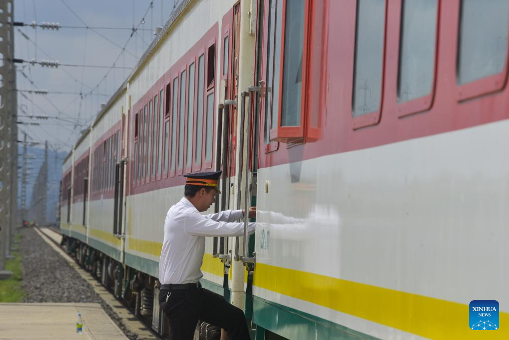 This photo taken on June 30, 2023 shows an Ethiopian train attendant at Lebu Railway Station in Addis Ababa, Ethiopia. Ethiopian experts and policymakers on Friday hailed the China-proposed Belt and Road Initiative (BRI) as a mutually beneficial cooperation platform advancing socioeconomic development in Ethiopia and beyond. (Xinhua/Michael Tewelde)