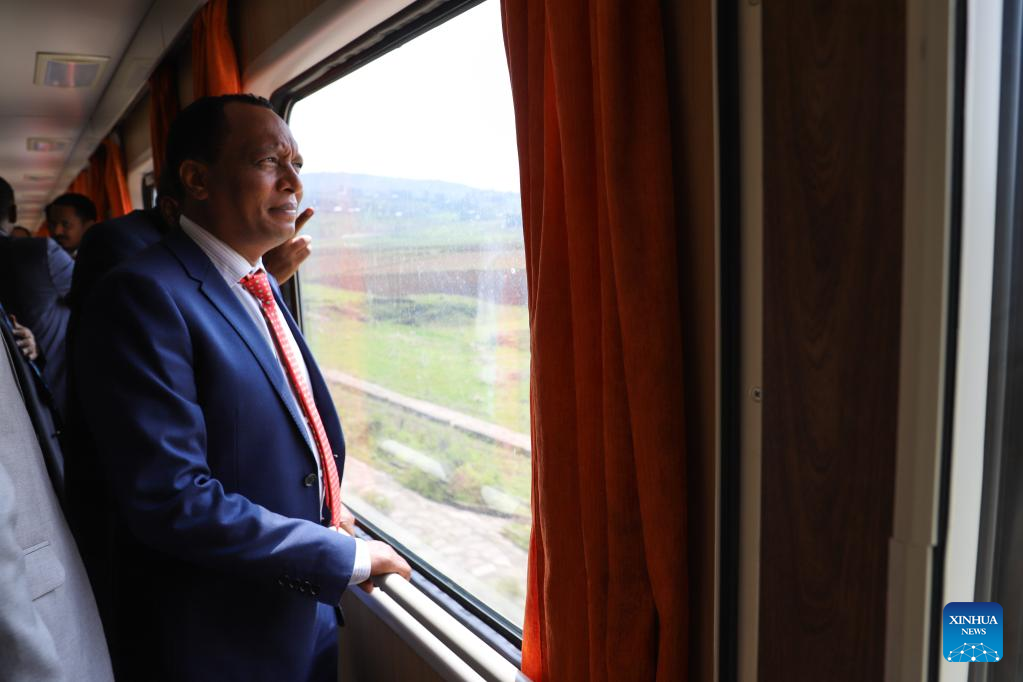 Ethiopian Minister of Transport and Logistics Alemu Sime takes a train operating along the Ethiopia-Djibouti Railway in Addis Ababa, Ethiopia, June 30, 2023. Ethiopian experts and policymakers on Friday hailed the China-proposed Belt and Road Initiative (BRI) as a mutually beneficial cooperation platform advancing socioeconomic development in Ethiopia and beyond. (Xinhua/Michael Tewelde)