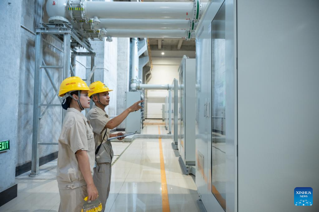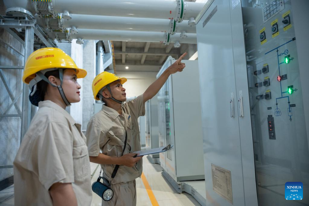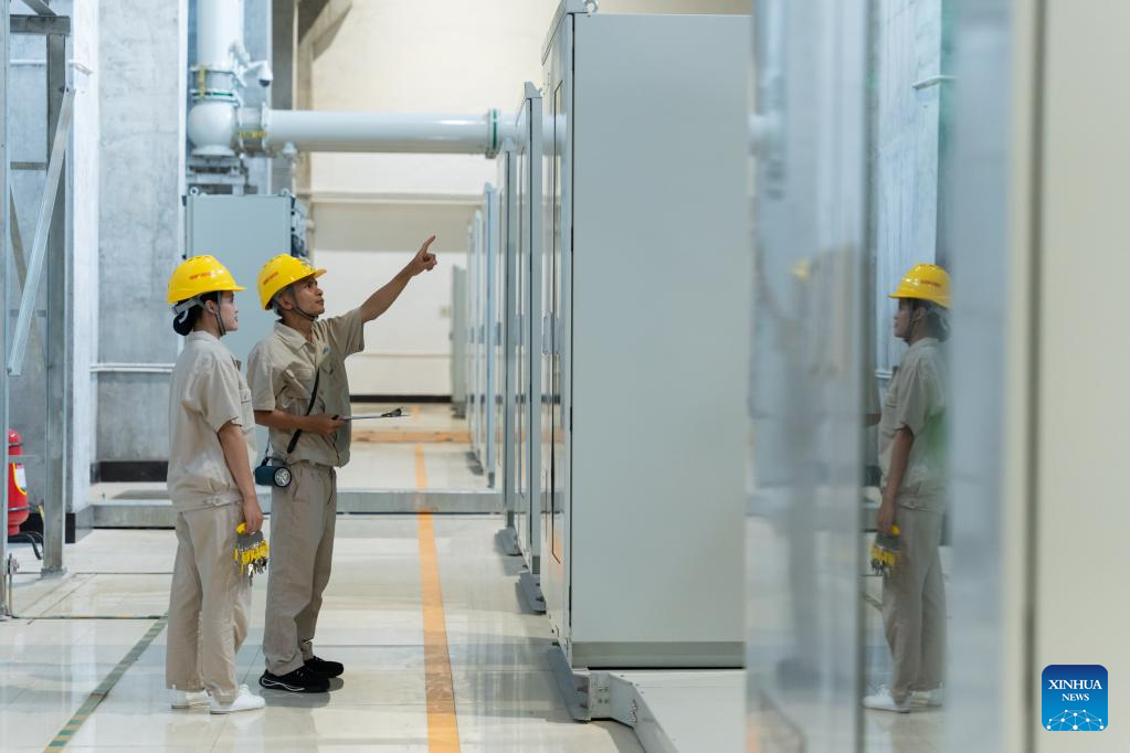 Nouphet Thongsakda (R) and Phavady Nalathone carry out daily check at the Nam Ou 1 hydropower plant invested by the Power Construction Corporation of China (PowerChina) in Luang Prabang, Laos, on June 16, 2023. Finding a life partner while chasing career dreams is not easy, but a young couple in northern Laos luckily got both when working for the PowerChina.(Photo by Kaikeo Saiyasane/Xinhua)