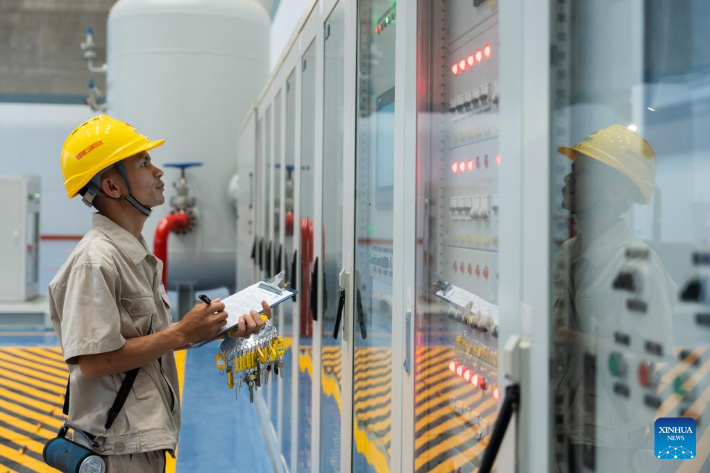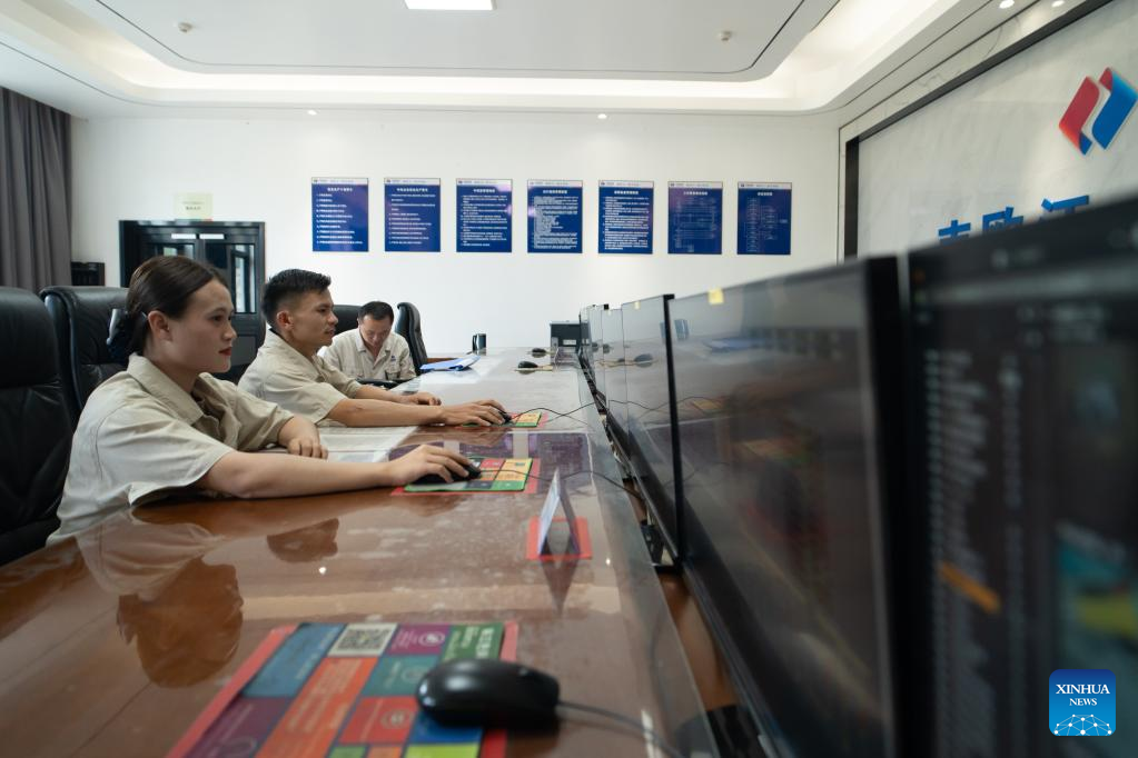 Nouphet Thongsakda records operation data at the Nam Ou 1 hydropower plant invested by the Power Construction Corporation of China (PowerChina) in Luang Prabang, Laos, on June 16, 2023. Finding a life partner while chasing career dreams is not easy, but a young couple in northern Laos luckily got both when working for the PowerChina.(Photo by Kaikeo Saiyasane/Xinhua)