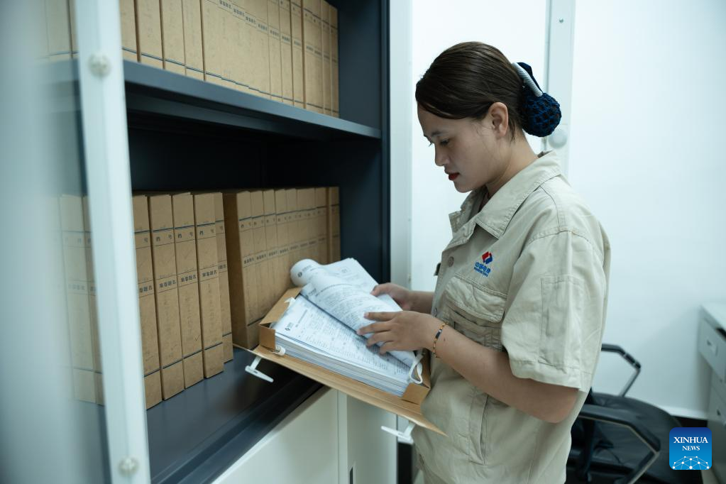 Phavady Nalathone sorts out documents in the office at the Nam Ou 1 hydropower plant invested by the Power Construction Corporation of China (PowerChina) in Luang Prabang, Laos, on June 16, 2023. Finding a life partner while chasing career dreams is not easy, but a young couple in northern Laos luckily got both when working for the PowerChina.(Photo by Kaikeo Saiyasane/Xinhua)
