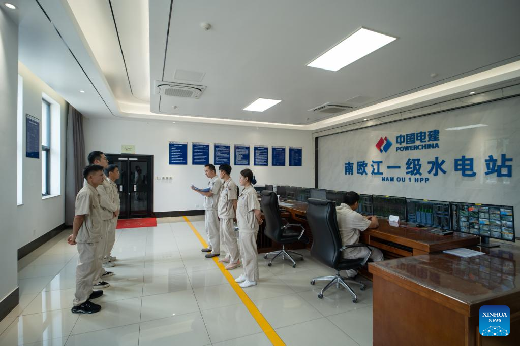 Nouphet Thongsakda and Phavady Nalathone attend the shift handover in the central control room of the Nam Ou 1 hydropower plant invested by the Power Construction Corporation of China (PowerChina) in Luang Prabang, Laos, on June 16, 2023. Finding a life partner while chasing career dreams is not easy, but a young couple in northern Laos luckily got both when working for the PowerChina.(Photo by Kaikeo Saiyasane/Xinhua)
