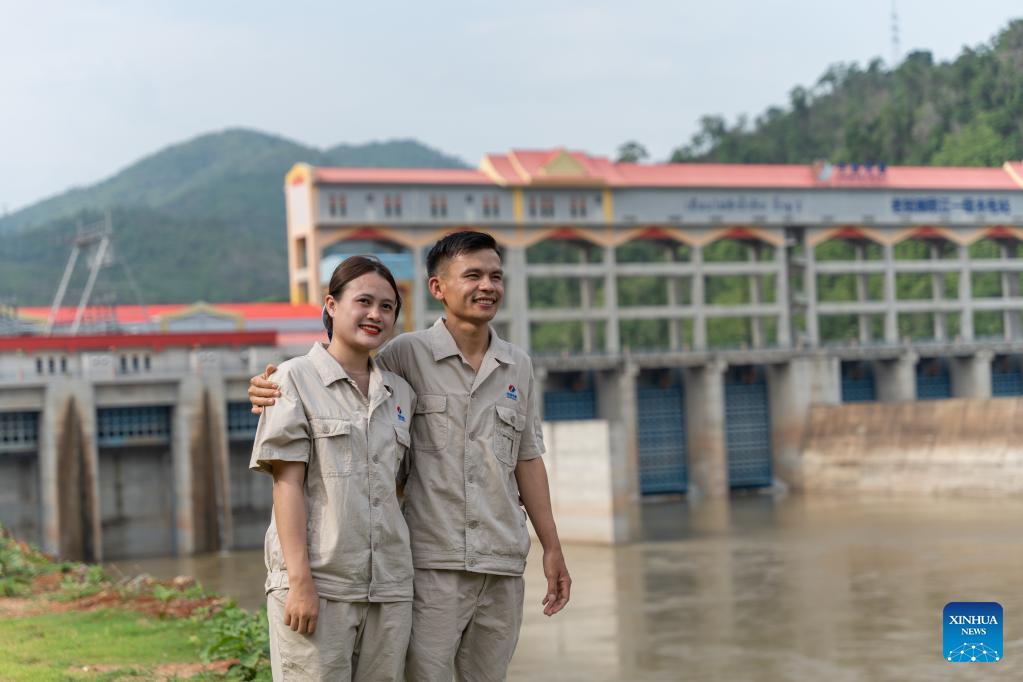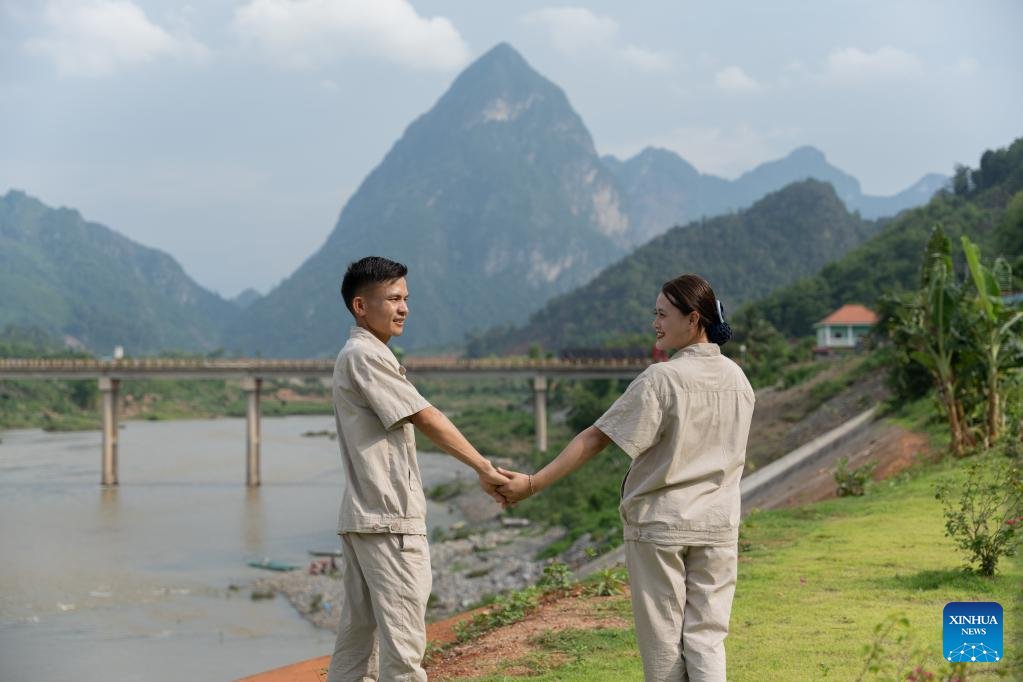 Nouphet Thongsakda (L) and Phavady Nalathone pose for photos at the Nam Ou 1 hydropower plant invested by the Power Construction Corporation of China (PowerChina) in Luang Prabang, Laos, on June 16, 2023. Finding a life partner while chasing career dreams is not easy, but a young couple in northern Laos luckily got both when working for the PowerChina.(Photo by Kaikeo Saiyasane/Xinhua)