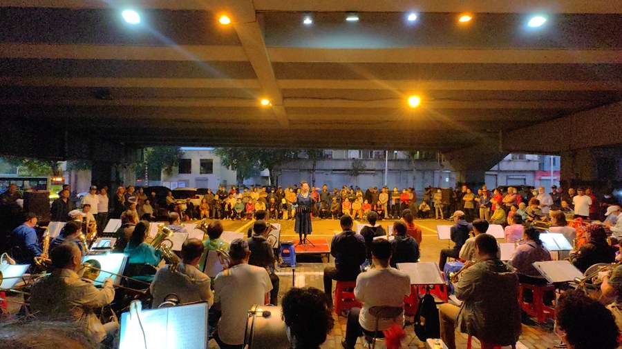 This photo taken with a mobile phone shows an amateur orchestra performing beneath an overpass in Harbin, northeast China's Heilongjiang Province, June 20, 2023. (Xinhua/Wang Junbao)