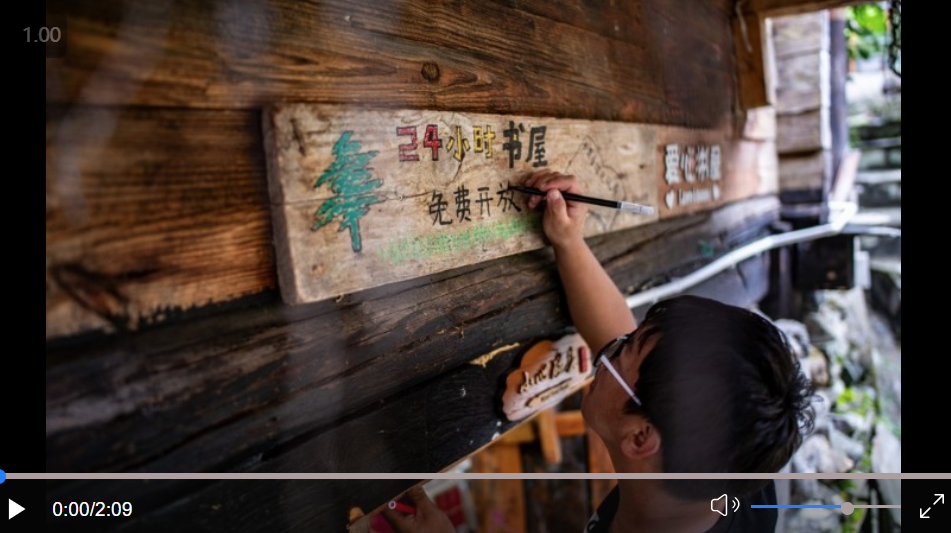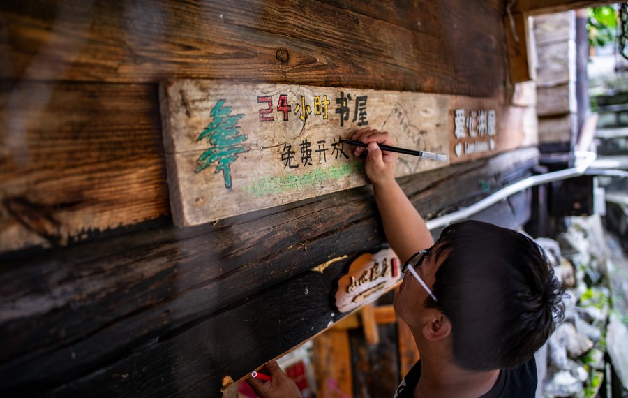 Gan Wenyong reemphasizes a slogan reading "free 24-hour library" at the "Banshan Huayu" library in Qiunatong Village of Bingzhongluo Township in Gongshan Dulong and Nu Autonomous County, Lisu Autonomous Prefecture of Nujiang, southwest China's Yunnan Province, July 6, 2023. (Xinhua/Jiang Wenyao)