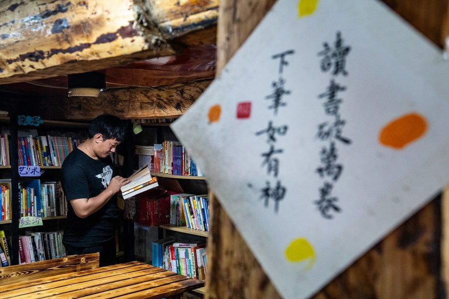Gan Wenyong arranges books at the "Banshan Huayu" library in Qiunatong Village of Bingzhongluo Township in Gongshan Dulong and Nu Autonomous County, Lisu Autonomous Prefecture of Nujiang, southwest China's Yunnan Province, July 5, 2023. (Xinhua/Jiang Wenyao)