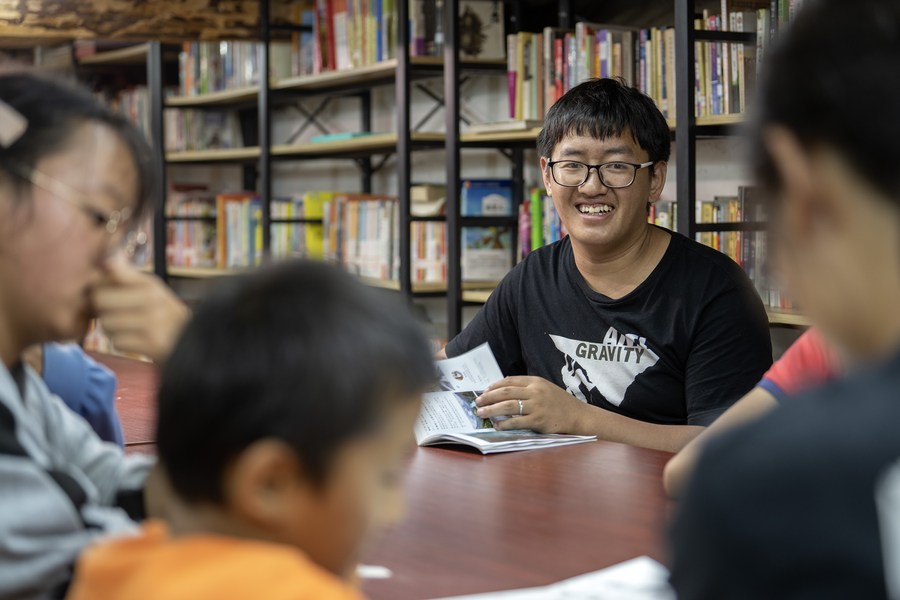 Gan Wenyong takes part in a reading activity with children at the "Banshan Huayu" library in Qiunatong Village of Bingzhongluo Township in Gongshan Dulong and Nu Autonomous County, Lisu Autonomous Prefecture of Nujiang, southwest China's Yunnan Province, July 5, 2023. (Xinhua/Fei Maohua)