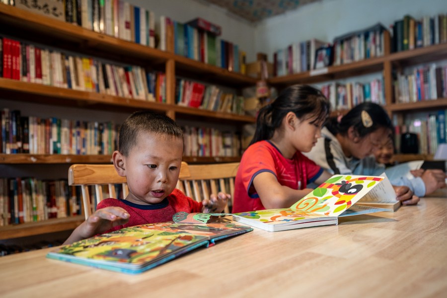 Children read books at the "Banshan Huayu" library in Qiunatong Village of Bingzhongluo Township in Gongshan Dulong and Nu Autonomous County, Lisu Autonomous Prefecture of Nujiang, southwest China's Yunnan Province, July 5, 2023. (Xinhua/Fei Maohua)