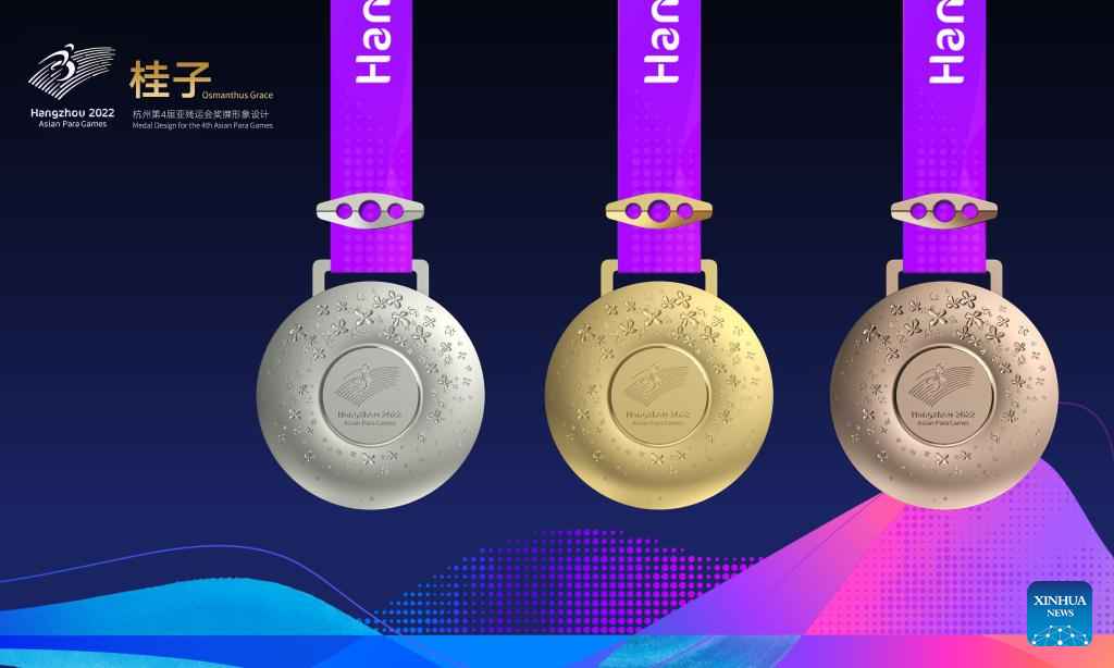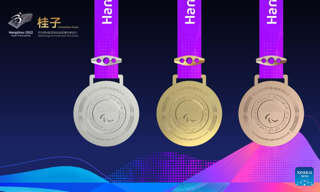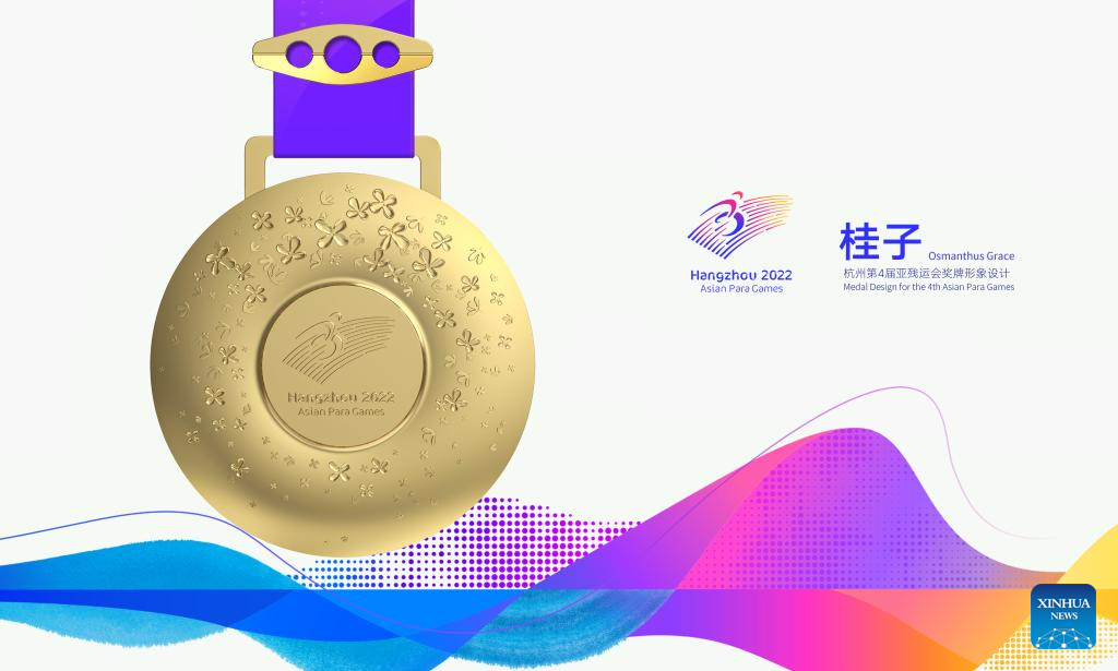 HANGZHOU, July 14 (Xinhua) -- With 100 days remaining before the Hangzhou Asian Para Games, the design of the medals and the materials to be used at award ceremonies were revealed on Friday at an event held at Fuyang Water Sports Center.
