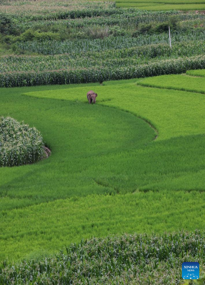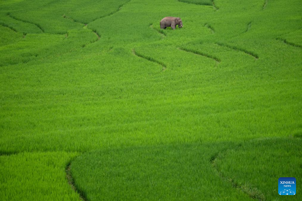 This aerial photo taken on July 19, 2023 shows an Asian elephant in rice fields in Jiangcheng Hani and Yi Autonomous County of Pu'er, southwest China's Yunnan Province. Asian elephants, a pivotal species in the rainforest ecosystem, are under first-class national protection in China. The elephants are mostly found across Yunnan.