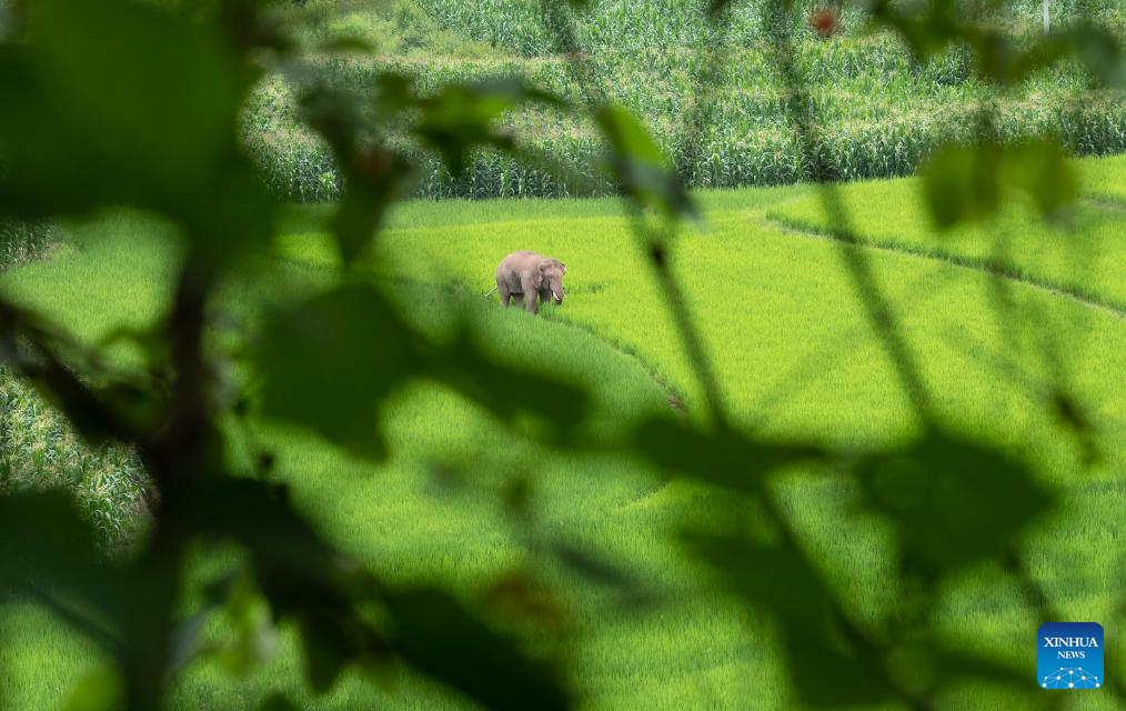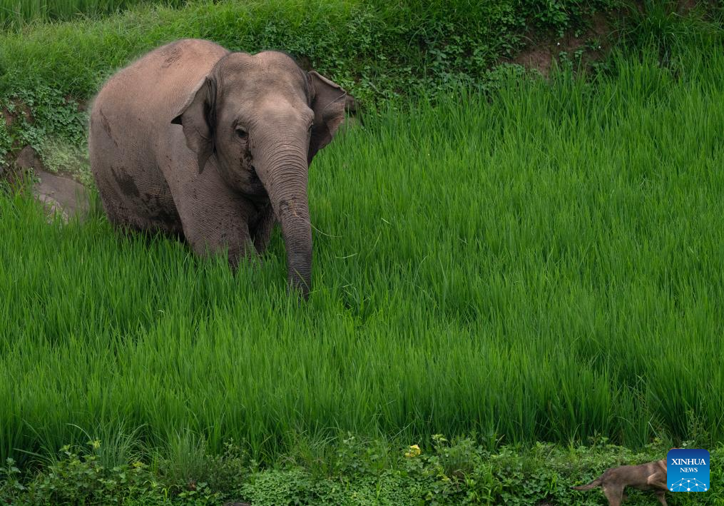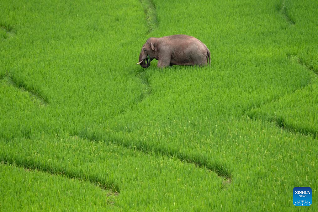 An Asian elephant eats in rice fields in Jiangcheng Hani and Yi Autonomous County of Pu'er, southwest China's Yunnan Province, July 19, 2023. Asian elephants, a pivotal species in the rainforest ecosystem, are under first-class national protection in China. The elephants are mostly found across Yunnan.