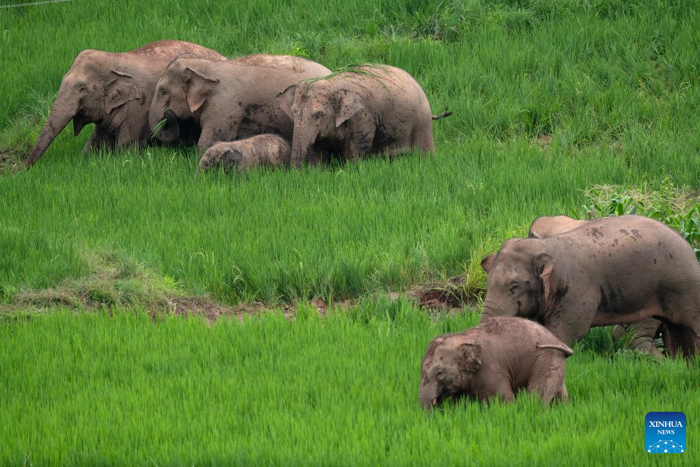 Asian elephants eat in rice fields in Jiangcheng Hani and Yi Autonomous County of Pu'er, southwest China's Yunnan Province, July 19, 2023. Asian elephants, a pivotal species in the rainforest ecosystem, are under first-class national protection in China. The elephants are mostly found across Yunnan.