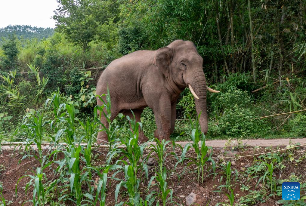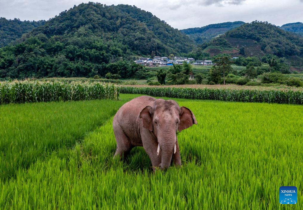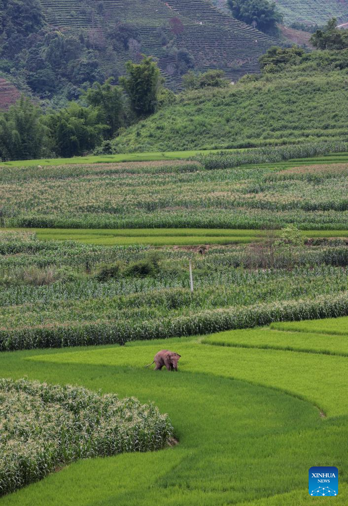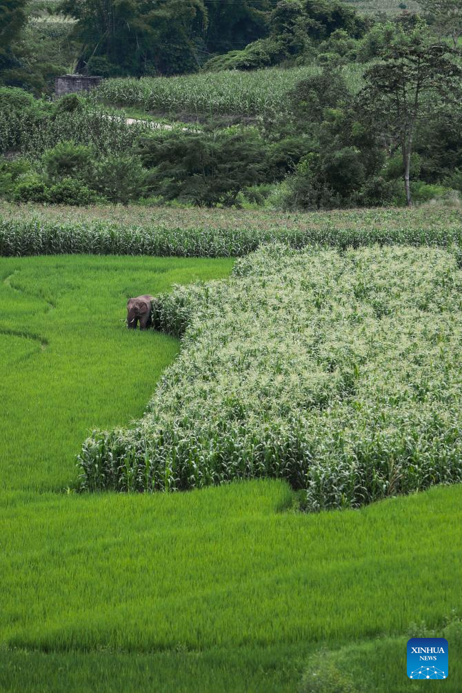 An Asian elephant eats in rice and corn fields in Jiangcheng Hani and Yi Autonomous County of Pu'er, southwest China's Yunnan Province, July 19, 2023. Asian elephants, a pivotal species in the rainforest ecosystem, are under first-class national protection in China. The elephants are mostly found across Yunnan.