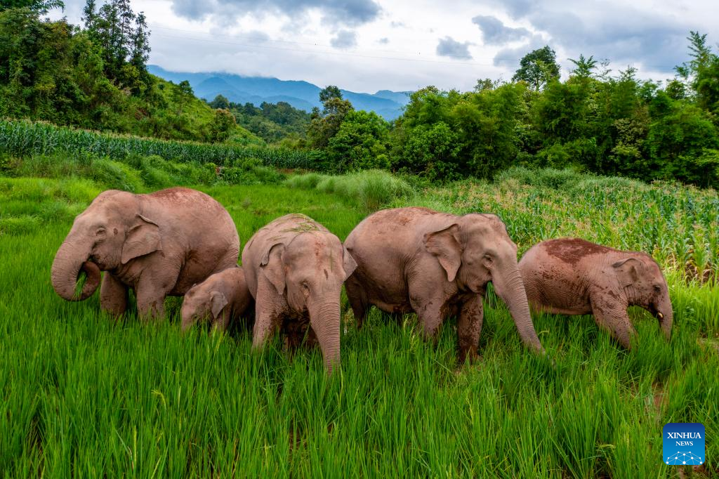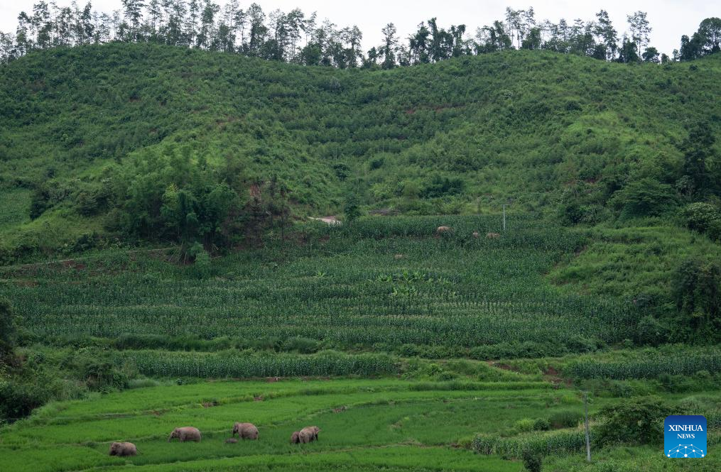 Asian elephants eat in rice and corn fields in Jiangcheng Hani and Yi Autonomous County of Pu'er, southwest China's Yunnan Province, July 19, 2023. Asian elephants, a pivotal species in the rainforest ecosystem, are under first-class national protection in China. The elephants are mostly found across Yunnan.