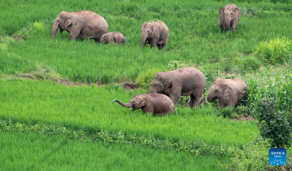 This aerial photo taken on July 19, 2023 shows Asian elephants in rice fields in Jiangcheng Hani and Yi Autonomous County of Pu'er, southwest China's Yunnan Province. Asian elephants, a pivotal species in the rainforest ecosystem, are under first-class national protection in China. The elephants are mostly found across Yunnan.