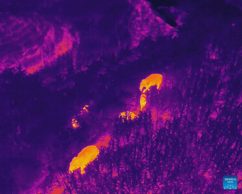 This aerial photo taken with a thermal imaging camera in the night of July 19, 2023 shows Asian elephants in Jiangcheng Hani and Yi Autonomous County of Pu'er, southwest China's Yunnan Province. Asian elephants, a pivotal species in the rainforest ecosystem, are under first-class national protection in China. The elephants are mostly found across Yunnan.