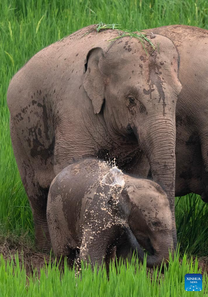 An Asian elephant cub plays with its mother in Jiangcheng Hani and Yi Autonomous County of Pu'er, southwest China's Yunnan Province, July 19, 2023. Asian elephants, a pivotal species in the rainforest ecosystem, are under first-class national protection in China. The elephants are mostly found across Yunnan.