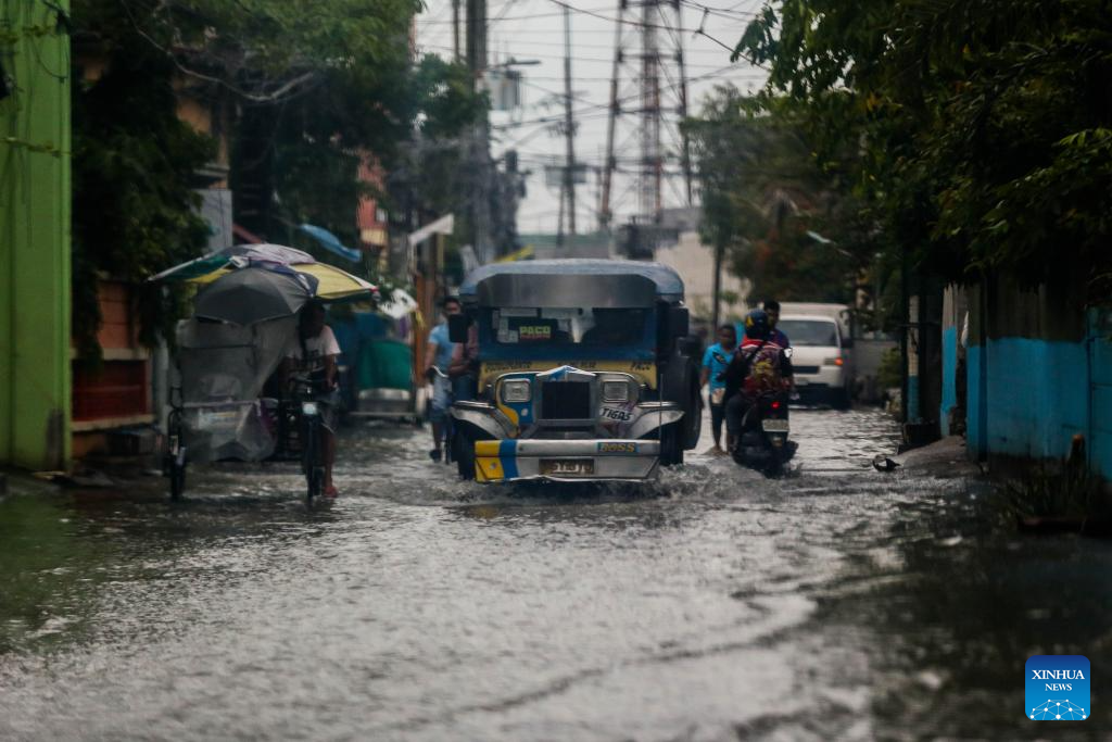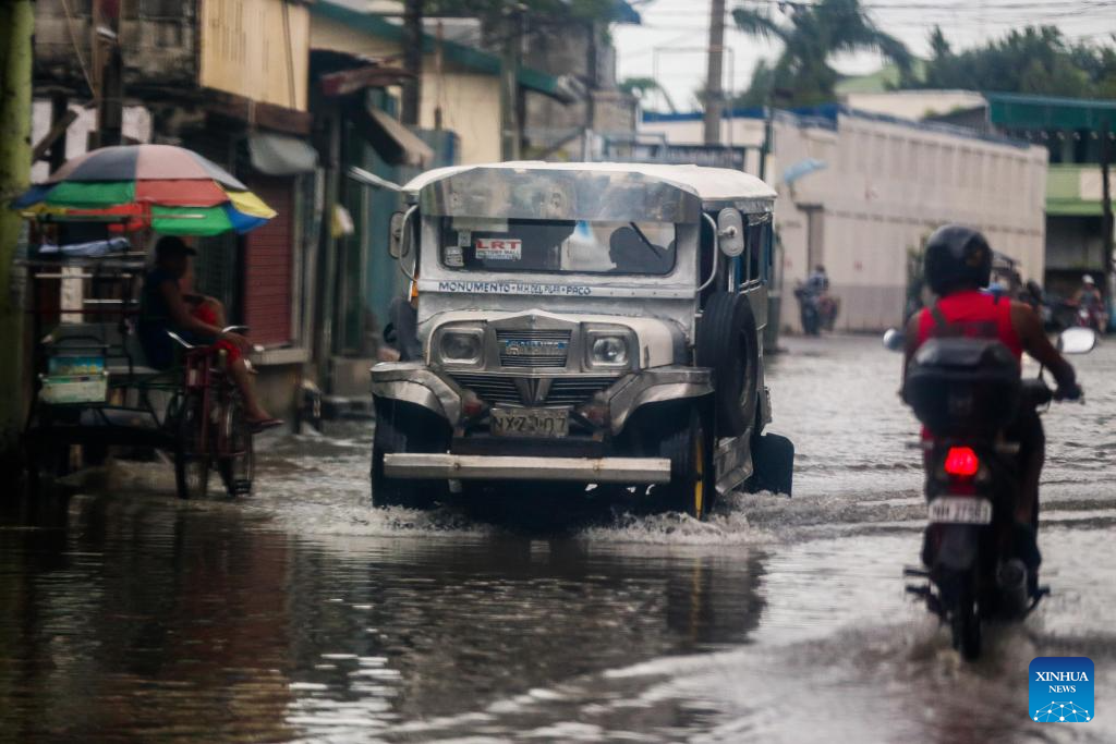 A jeepney drives through a water-logged area in Malabon City, the Philippines, on July 26, 2023. The Philippines' national disaster agency on Wednesday said it has so far tallied at least one dead as Typhoon Doksuri continued to batter the country with rain and strong winds.