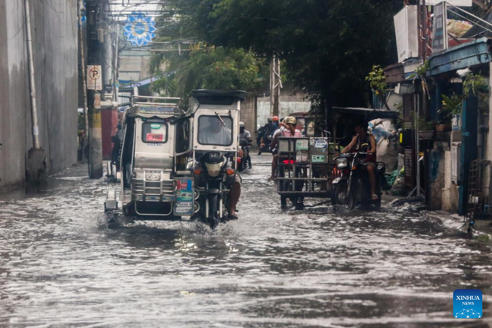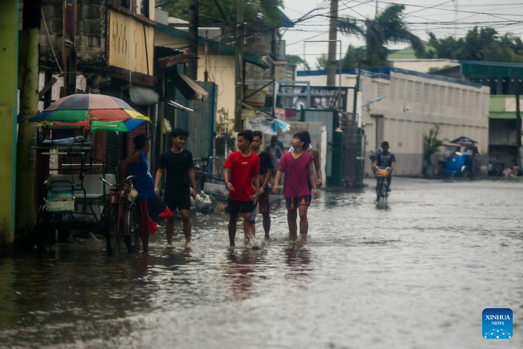 People wade through a water-logged area in Malabon City, the Philippines, on July 26, 2023. The Philippines' national disaster agency on Wednesday said it has so far tallied at least one dead as Typhoon Doksuri continued to batter the country with rain and strong winds.