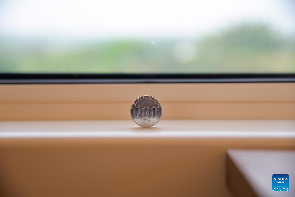 An Indonesian coin stands firmly on the windowsill of a comprehensive inspection train during the joint commissioning and testing phase for the Jakarta-Bandung High-Speed Railway in Indonesia, June 22, 2023. The comprehensive inspection train (CIT) of Jakarta-Bandung High-Speed Railway (HSR) reached 350 km per hour, the design speed, for the first time on Thursday during the joint commissioning and testing phase. (Xinhua/Xu Qin)
