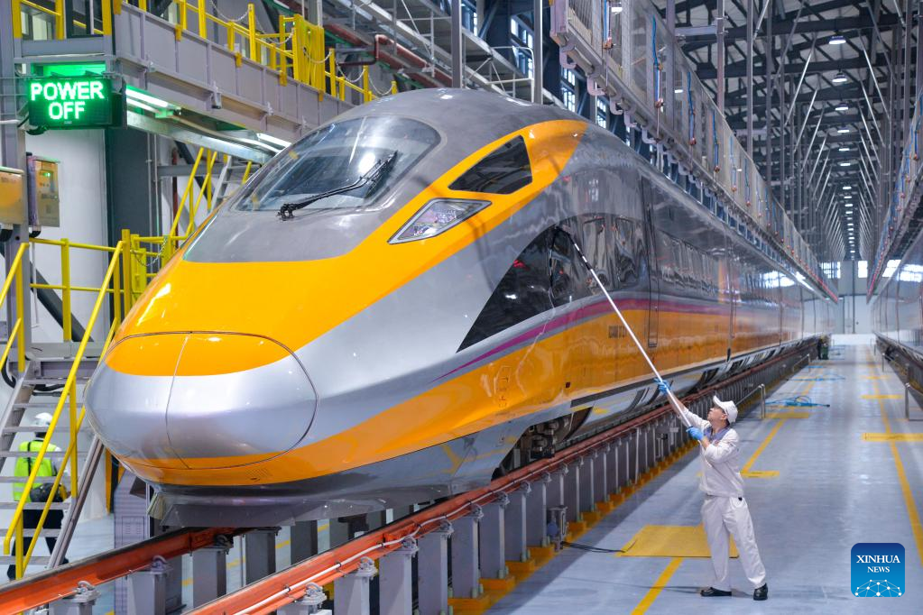 A staff member cleans a comprehensive inspection train at a workshop for the Jakarta-Bandung High-Speed Railway in Bandung, Indonesia, June 21, 2023. The comprehensive inspection train (CIT) of Jakarta-Bandung High-Speed Railway (HSR) reached 350 km per hour, the design speed, for the first time on Thursday during the joint commissioning and testing phase. (Xinhua/Xu Qin)
