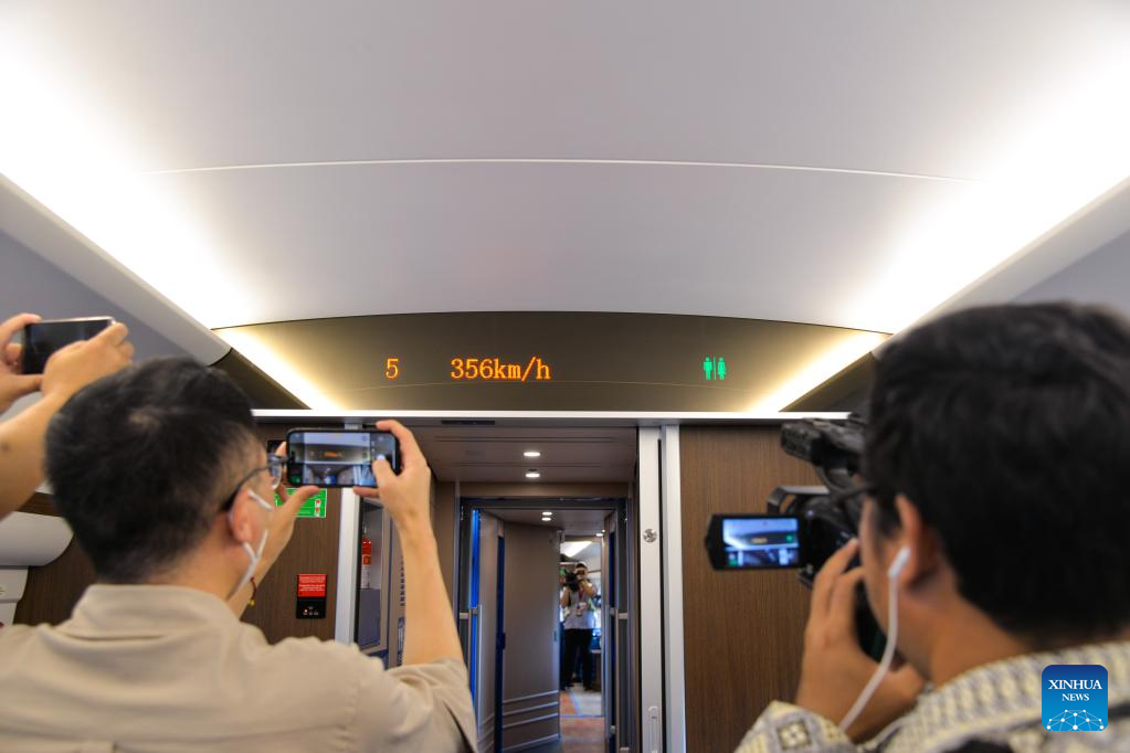 Journalists take photos and videos of a train screen which shows the train speed exceeding 350 kilometers per hour on a comprehensive inspection train during the joint commissioning and testing phase for the Jakarta-Bandung High-Speed Railway in Indonesia, June 22, 2023. The comprehensive inspection train (CIT) of Jakarta-Bandung High-Speed Railway (HSR) reached 350 km per hour, the design speed, for the first time on Thursday during the joint commissioning and testing phase. (Xinhua/Xu Qin)