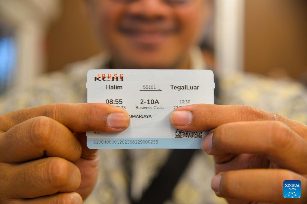 A journalist shows a Jakarta-Bandung High-Speed Railway commemorative sample ticket on a comprehensive inspection train during the joint commissioning and testing phase for the Jakarta-Bandung High-Speed Railway in Indonesia, June 22, 2023. The comprehensive inspection train (CIT) of Jakarta-Bandung High-Speed Railway (HSR) reached 350 km per hour, the design speed, for the first time on Thursday during the joint commissioning and testing phase. (Xinhua/Xu Qin)