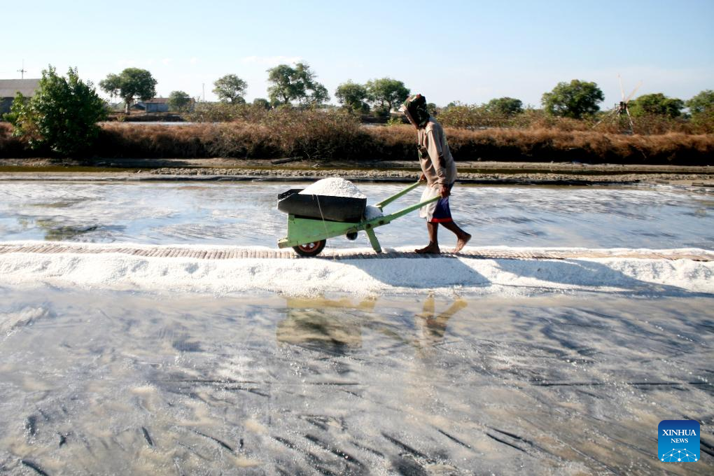 A farmer holds a cart carrying harvested salt in Tambak Cemandi village in Sidoarjo, East Java, Indonesia, July 31, 2023. (Photo by Sahlan Kurniawan/Xinhua)