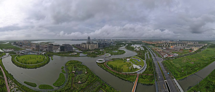 This aerial panoramic photo taken on Aug. 1, 2023 shows the Dishui Lake at the Lingang new area of the China (Shanghai) Pilot Free Trade Zone in east China's Shanghai. (Xinhua/Fang Zhe)