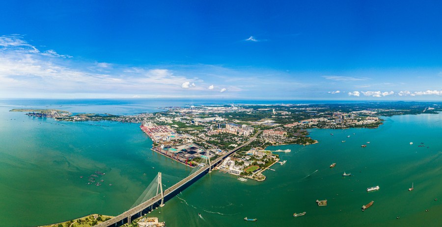 This aerial panoramic photo taken on Oct. 2, 2022 shows the Yangpu Economic Development Zone in south China's Hainan Province. (Xinhua/Pu Xiaoxu)