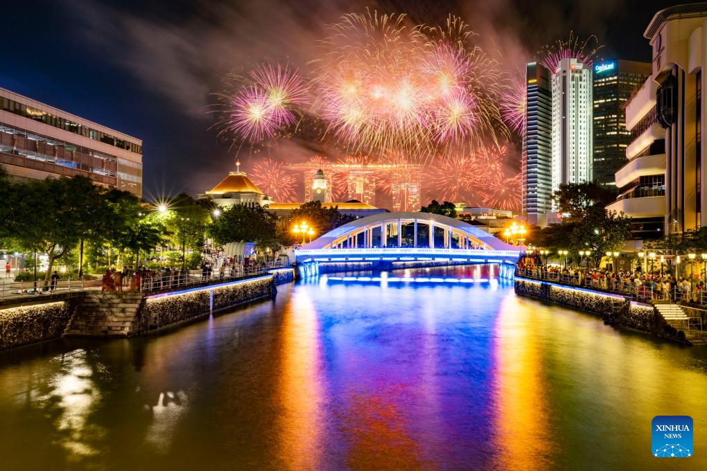 Fireworks light up the sky during the National Day Parade at Singapore's Padang on Aug. 9, 2023. Singapore held a National Day Parade on Wednesday to celebrate its 58th anniversary at Padang, an open playing field near the iconic Marina Bay, with a military show, performances and fireworks. (Photo by Then Chih Wey/Xinhua)