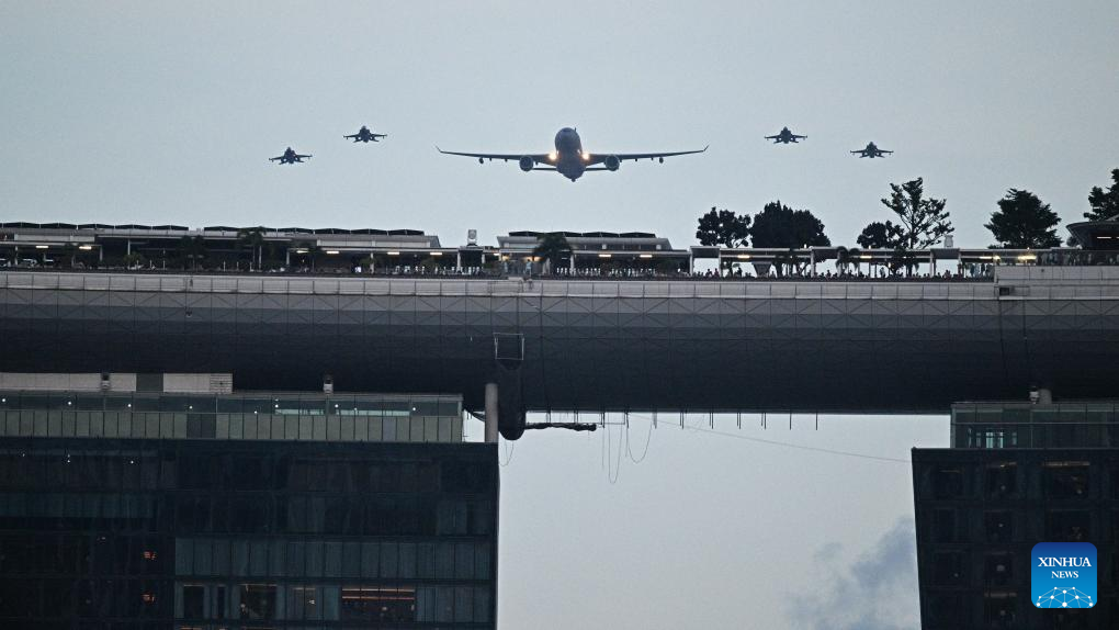 Singapore's air force dispatched 21 aircraft, including helicopters, fighter jets and transport planes, for aerial display. Eight skydivers of the country's "Red Lions" team also performed at the event.