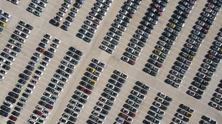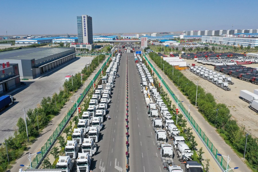 This aerial photo taken on July 26, 2023 shows domestically-made vehicles at the Horgos comprehensive bonded area in northwest China's Xinjiang Uygur Autonomous Region. More and more domestically-made automobiles have been exported through the Horgos Port, one of China's closest ports to Central Asia and Europe by land transport, to countries along the Belt and Road, including Kazakhstan, Uzbekistan and Russia. (Xinhua/Ding Lei)