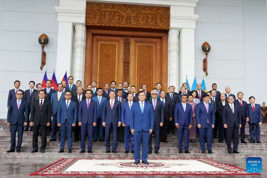 Cambodia's Prime Minister-Designate Hun Manet (C, front) poses for group photos with his incoming new cabinet members in Phnom Penh, Cambodia, Aug. 10, 2023. Cambodia's outgoing Prime Minister Samdech Techo Hun Sen on Thursday afternoon unveiled the incoming government members led by his eldest son Hun Manet. (Photo by Ly Lay/Xinhua)
