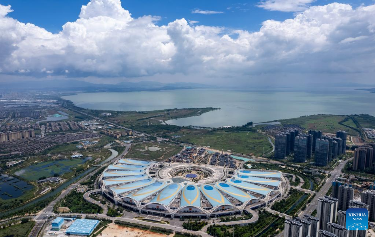This aerial photo taken on Aug. 7, 2023 shows a view of Kunming Dianchi International Convention and Exhibition Center, the venue for the seventh China-South Asia Expo in Kunming, southwest China's Yunnan Province. The seventh China-South Asia Expo kicked off Wednesday in Kunming.