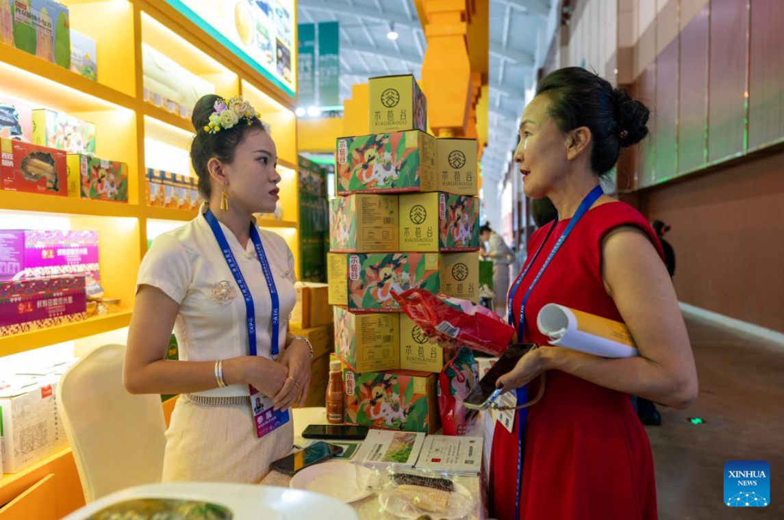 An exhibitor (L) introduces products at the seventh China-South Asia Expo in Kunming, southwest China's Yunnan Province, Aug. 16, 2023. The seventh China-South Asia Expo kicked off Wednesday in Kunming.