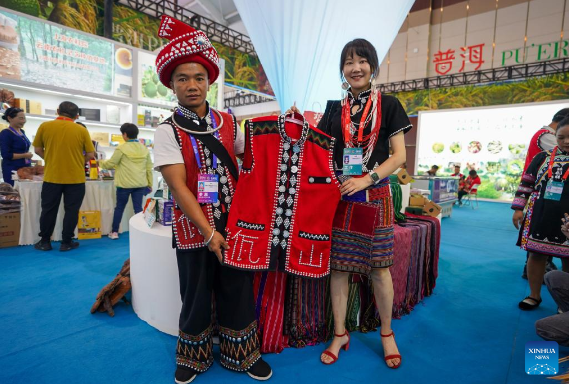 Exhibitors present traditional clothes of Va ethnic group at the seventh China-South Asia Expo in Kunming, southwest China's Yunnan Province, Aug. 16, 2023. The seventh China-South Asia Expo kicked off Wednesday in Kunming.